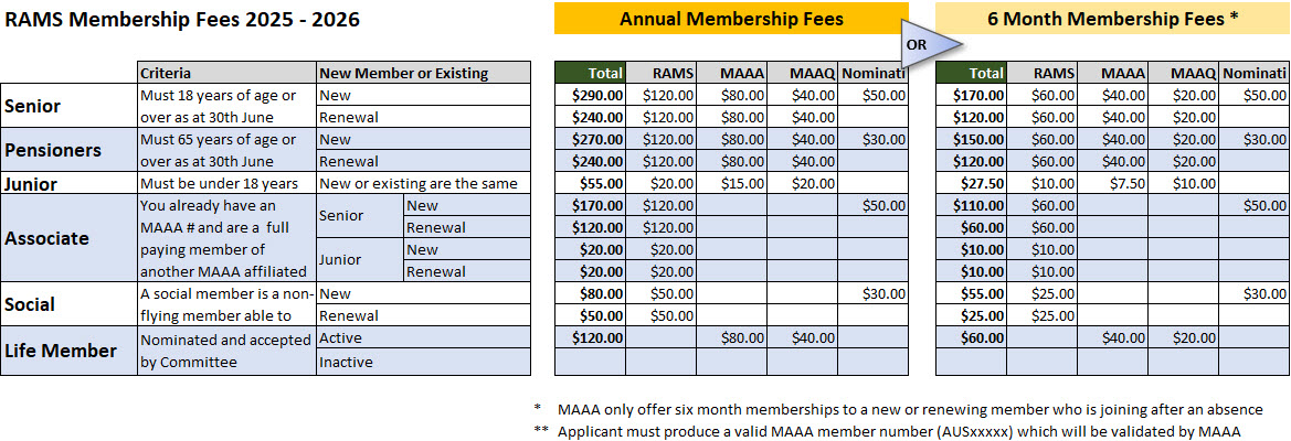 - All membership fees cover membership and insurance with the Model Aeronautical Association of Australia (MAAA) as well as Model Aeronautical Association of Queensland (MAAQ) for which RAMS is affiliated